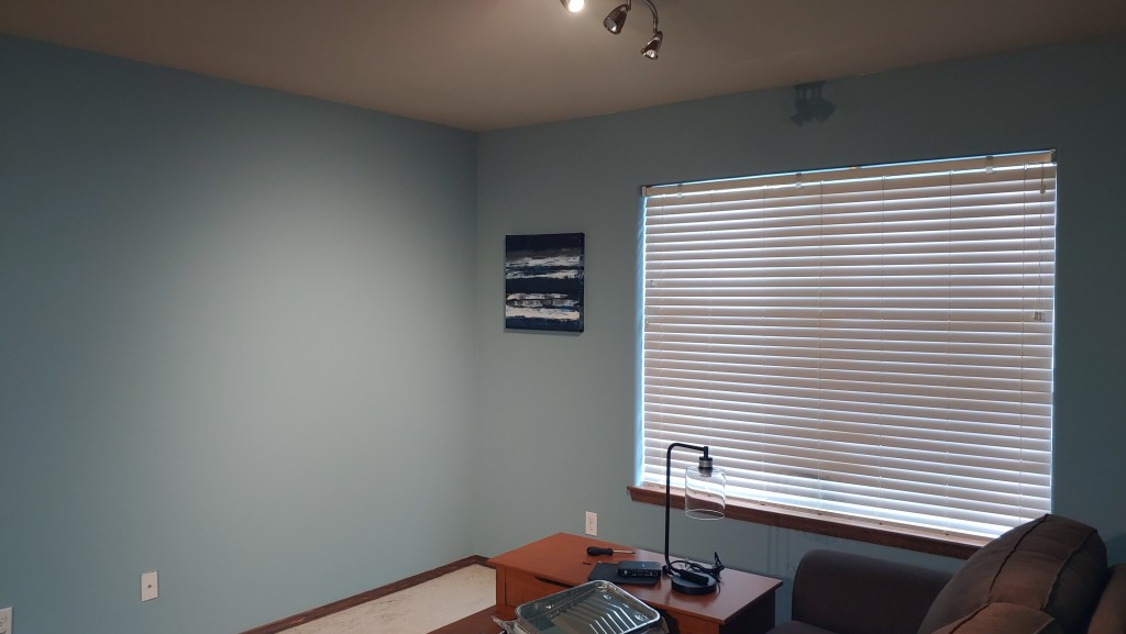 I wake up early and I paint our bonus room. I know I nailed the color because my soul feels increasingly calm as the walls are bathed in this soft blue-gray.