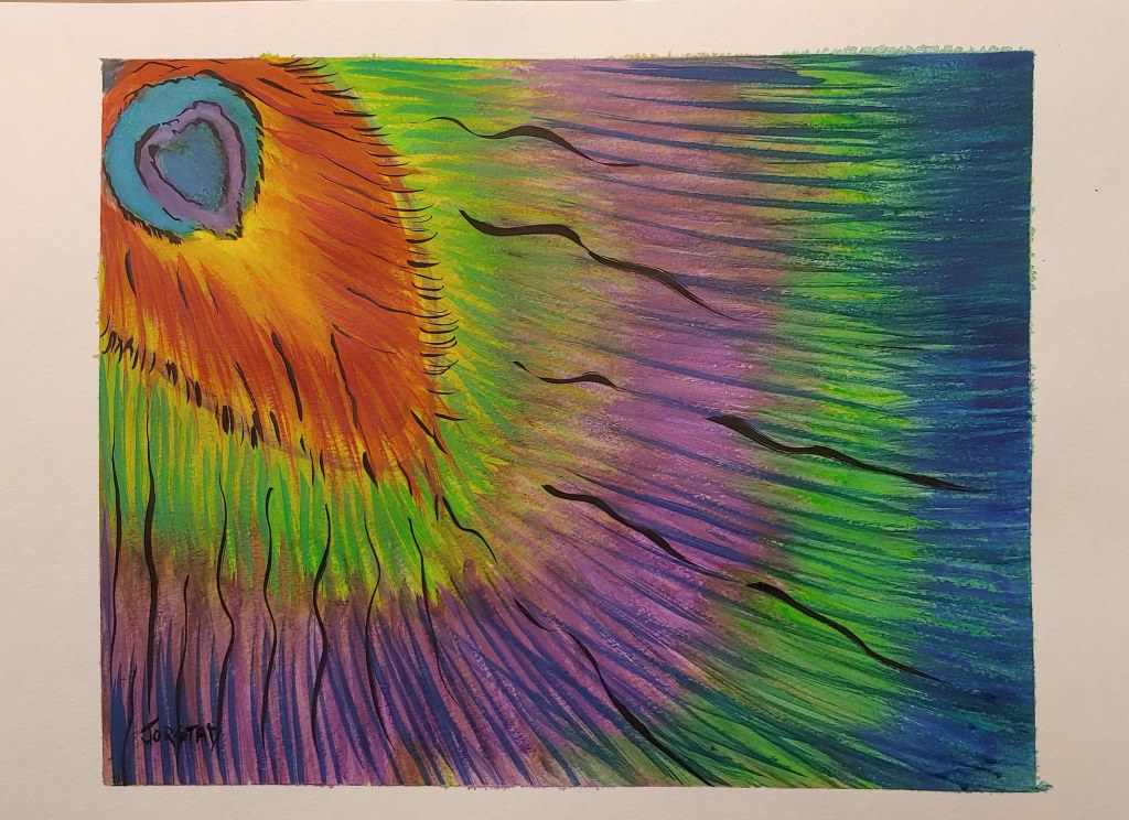 I head to the store to grab a few things including unhealthy food and return to painting. Searching for inspiration for beautiful masculine energy…ah yes, a peacock. But the painting isn’t going well. I consider walking away. I check my phone. Nothing to report. One of our two new kittens crawls up into the hood of my sweatshirt. Well, since I am here anyway and have already ruined this piece I might as well experiment a bit.