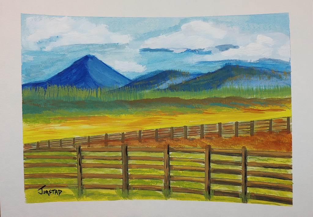 I paint. I barely color the sky, fluff the clouds. The mountain is majestic and cold. The meadow races to the fence in the foreground. My phone buzzes with an incoming message.